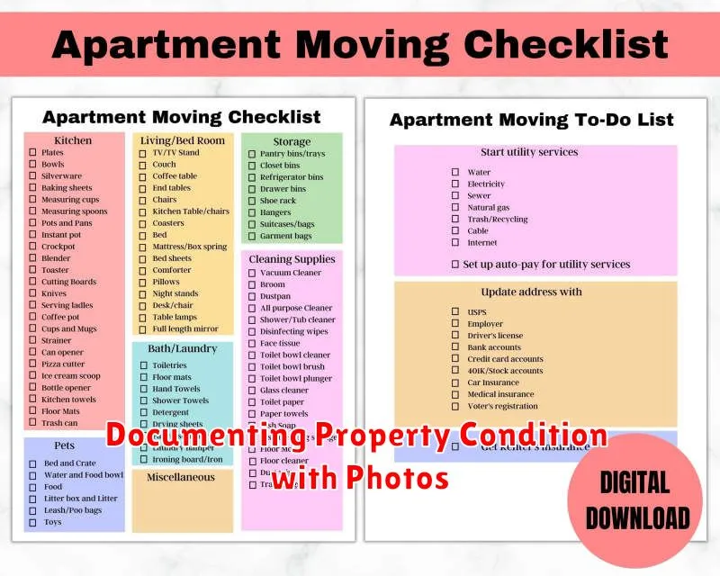 Take photos of every room, including close-ups of any existing damage, such as scratches, stains, or cracks. Pay particular attention to appliances, fixtures, and areas prone to wear and tear. Date and time stamp your photos if possible, for added verification.